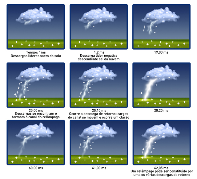 先导放电来自上方,带负电荷。光束的第一冲击的特征是电流在2/200 kA之间。通常,在第一次放电后,离子通道已被“打开”,随后的电流最终具有较小的能量贡献。
