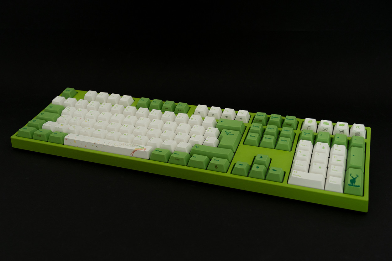乍一看,Varmilo VA109M森林仙子与传统机械键盘有很大不同。最初的实际结构不太醒目:键盘基于绝对笔直,稳定的ABS塑料底盘,按键周围只有较薄的边缘。另一方面,配色方案确实非常出色:与森林主题保持一致,房屋完全采用叶绿色。另外,它在表面上具有沟槽状的结构,让人联想到木纹和叶子表面的混合物。与键帽的浅色,白色和绿色相结合,桌子上的森林仙子立即引起了人们的注意。