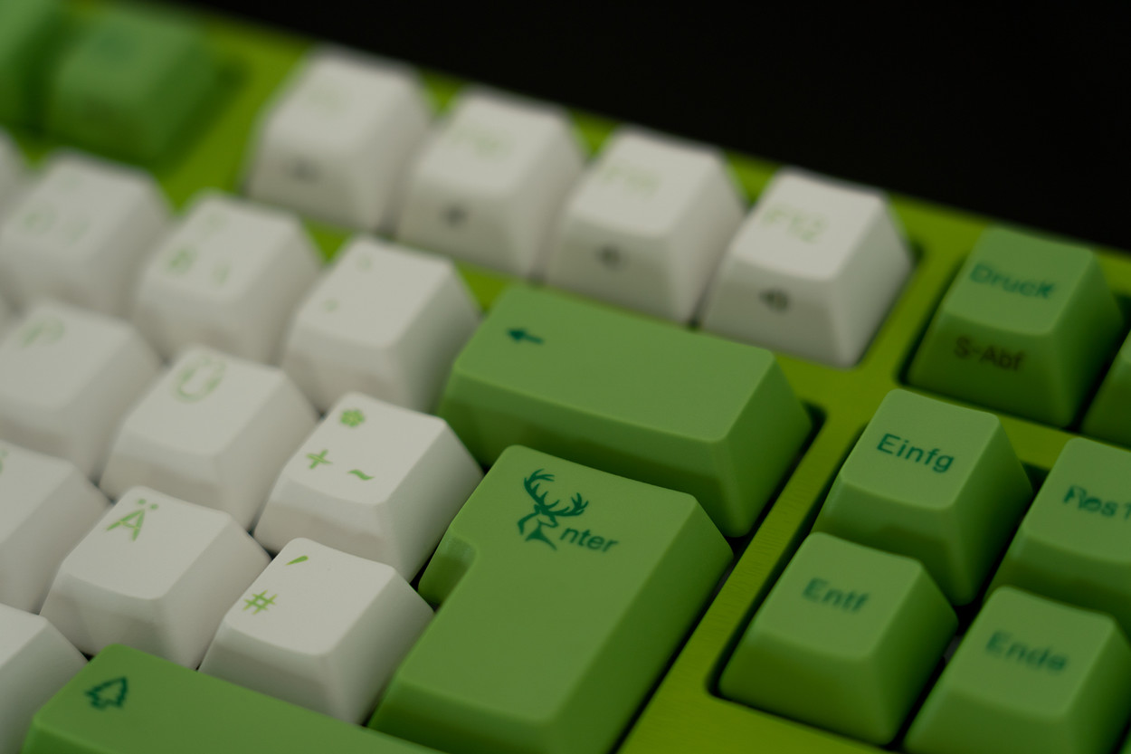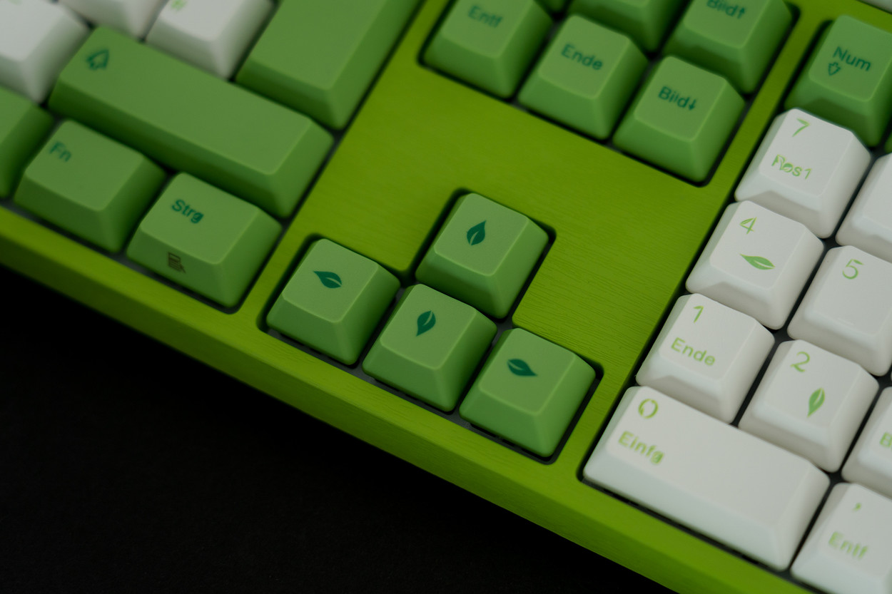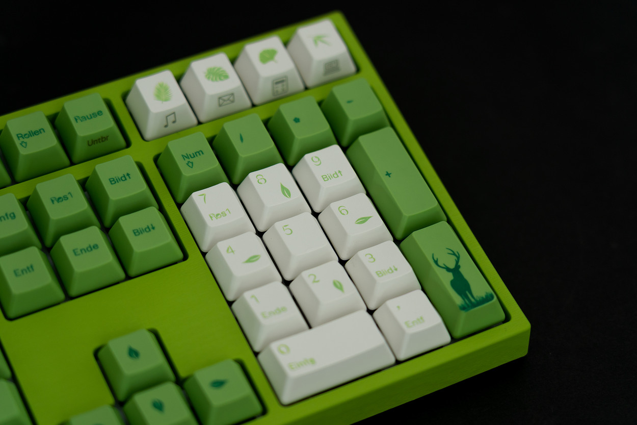 乍一看,Varmilo VA109M森林仙子与传统机械键盘有很大不同。最初的实际结构不太醒目:键盘基于绝对笔直,稳定的ABS塑料底盘,按键周围只有较薄的边缘。另一方面,配色方案确实非常出色:与森林主题保持一致,房屋完全采用叶绿色。另外,它在表面上具有沟槽状的结构,让人联想到木纹和叶子表面的混合物。与键帽的浅色,白色和绿色相结合,桌子上的森林仙子立即引起了人们的注意。