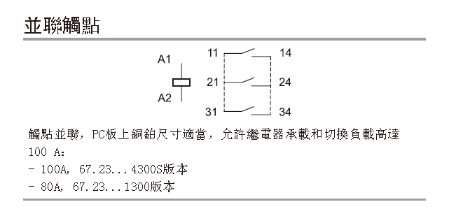 67.23.9.024.4300S的继电器是只有一组触点脚在外面,内部触点已并联,并联后的额定电流是100A。