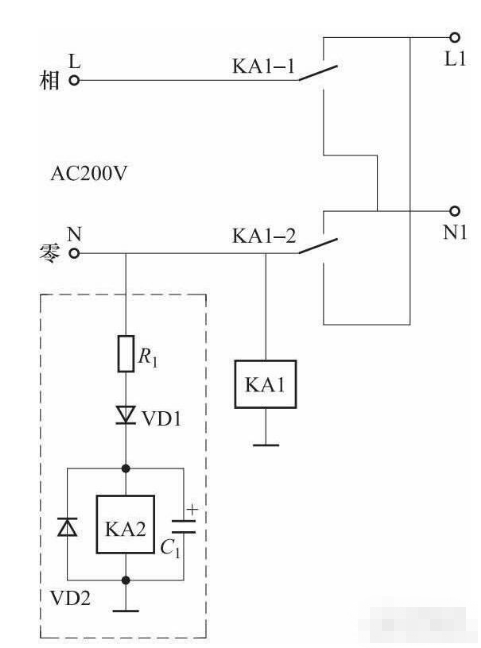 其上面一根线上所接的零线就会经KA1—1闭合的动合触点从N1端输出,而其下面一根线上所接的相线就会经KA1—2闭合